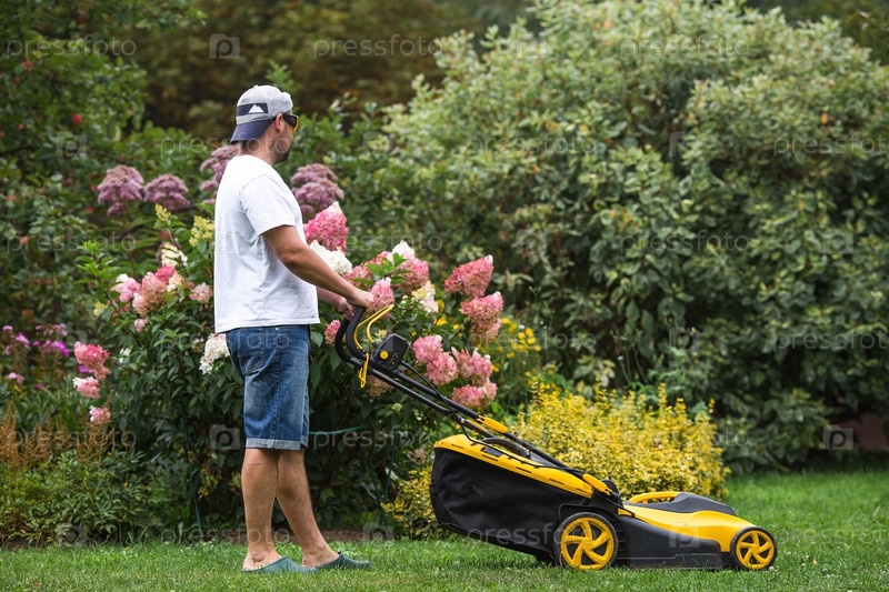 Баннер. Газонокосильщик косит траву на заднем дворе. Сельскохозяйственная техника для ухода за садом