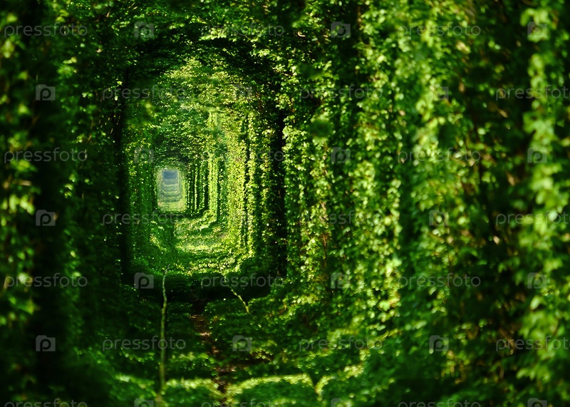 Зеленый длинный туннель любви с железной дорогой