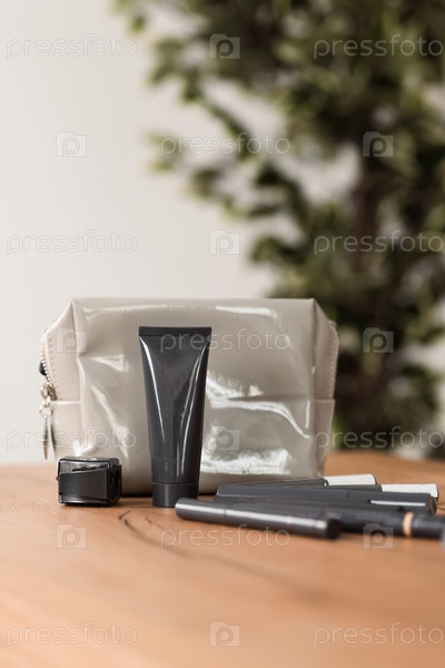 Косметические принадлежности размещены в помещении на столе крупным планом