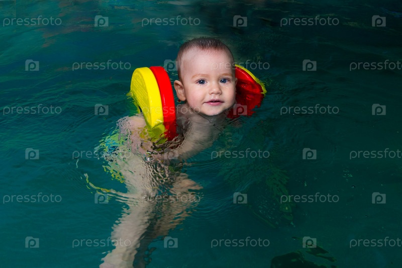 Ребенок в спасательных повязках учится плавать в бассейне, крупный план сверху