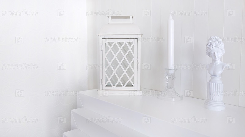 Красивая композиция с местом для текста, с подсвечником, фонарем и статуэткой женщины. Текстура или фон