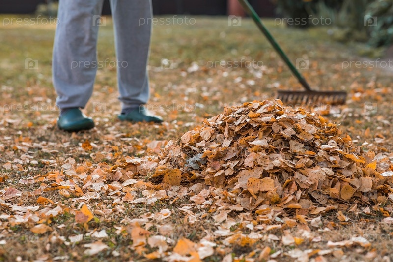 Куча осенних листьев и женщина делает генеральную уборку в саду. Осенью люди чистят газон от сухих листьев. Садоводство. Уборка сада