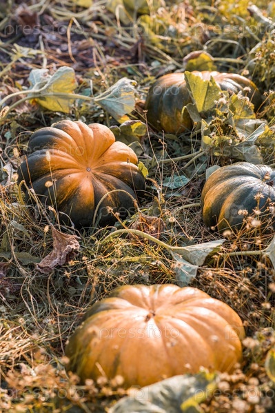 Осенний тыквенный фон. Богатый урожай дынных тыкв в саду. Сбор урожая. Концепция праздника Хэллоуин или День благодарения