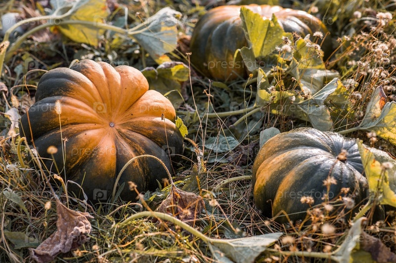 Осенний тыквенный фон. Богатый урожай дынных тыкв в саду. Сбор урожая. Концепция праздника Хэллоуин или День благодарения