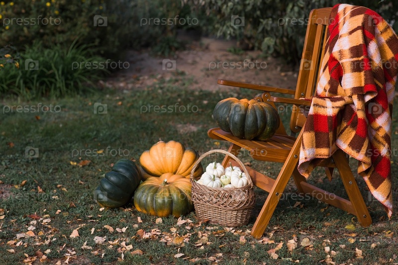 Осенний тыквенный фон. Белые тыквы в плетеной корзине. Богатый урожай. Концепция праздника Хэллоуин или День благодарения