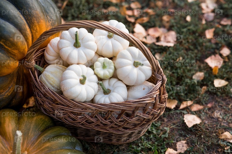 Осенний тыквенный фон. Белые тыквы в плетеной корзине. Богатый урожай. Концепция праздника Хэллоуин или День благодарения