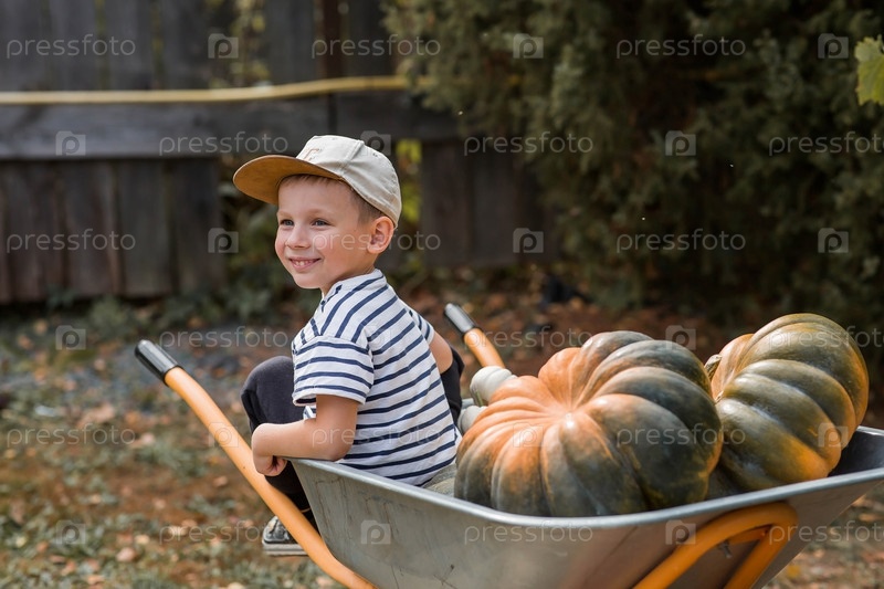 Осенний урожай богатого урожая тыкв и красивый 5-летний мальчик в садовой тачке. Концепция праздника Хэллоуин или День благодарения