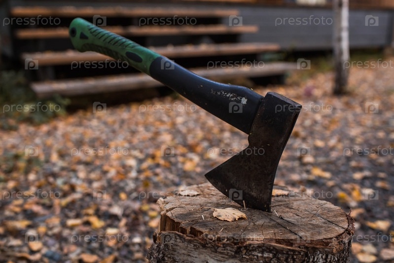 Топор будет воткнут в деревянное бревно. Заготовка дров на зиму. Рубка леса на фоне загородного дома. Пиломатериалы, инструменты для рубки леса