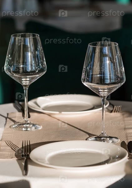 Стильная сервировка стола. Стеклянные бокалы, тарелки, столовые приборы на столе. Свадебный сервиз, прием за обеденным столом. День рождения, крещение, праздничное мероприятие