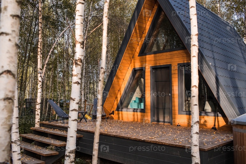 А-образный каркасный дом в скандинавском стиле. Ландшафт. Тихий отдых. Концепция глэмпинга и аренды шале. Деревянный дом с верандой на природе вокруг осеннего березового леса