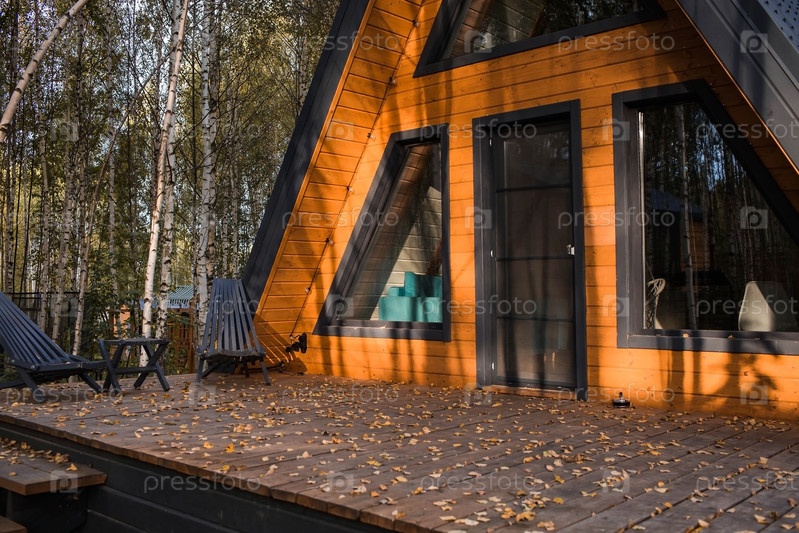 А-образный каркасный дом в скандинавском стиле. Ландшафт. Тихий отдых. Концепция глэмпинга и аренды шале. Деревянный дом с верандой на природе вокруг осеннего березового леса