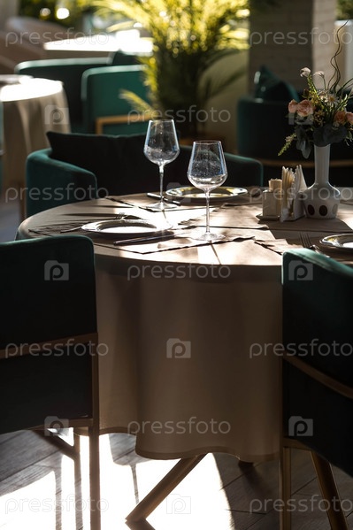 Стильная сервировка стола. Стеклянные бокалы, тарелки, столовые приборы на столе. Свадебный сервиз, прием за обеденным столом. День рождения, крещение, праздничное мероприятие