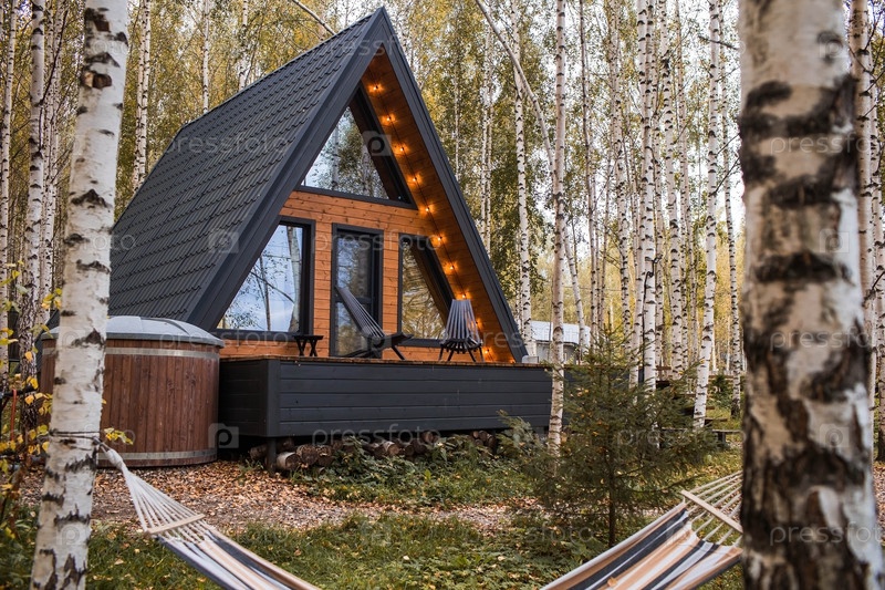 А-образный каркасный дом в скандинавском стиле. Ландшафт. Тихий отдых. Концепция глэмпинга и аренды шале. Деревянный дом с верандой на природе вокруг осеннего березового леса