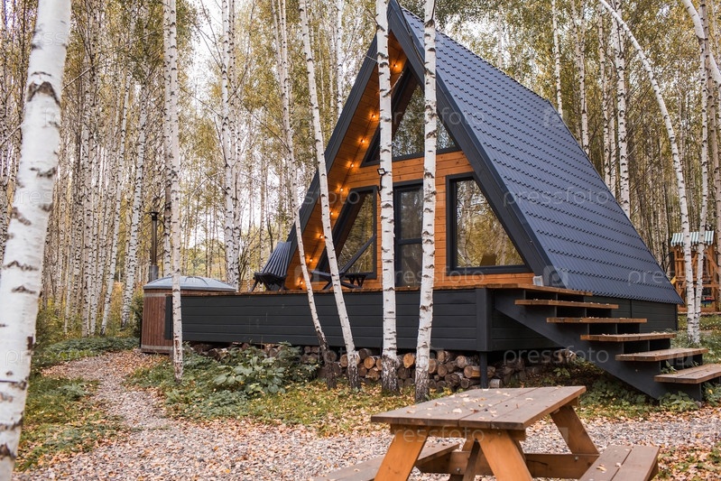 А-образный каркасный дом в скандинавском стиле. Ландшафт. Тихий отдых. Концепция глэмпинга и аренды шале. Деревянный дом с верандой на природе вокруг осеннего березового леса