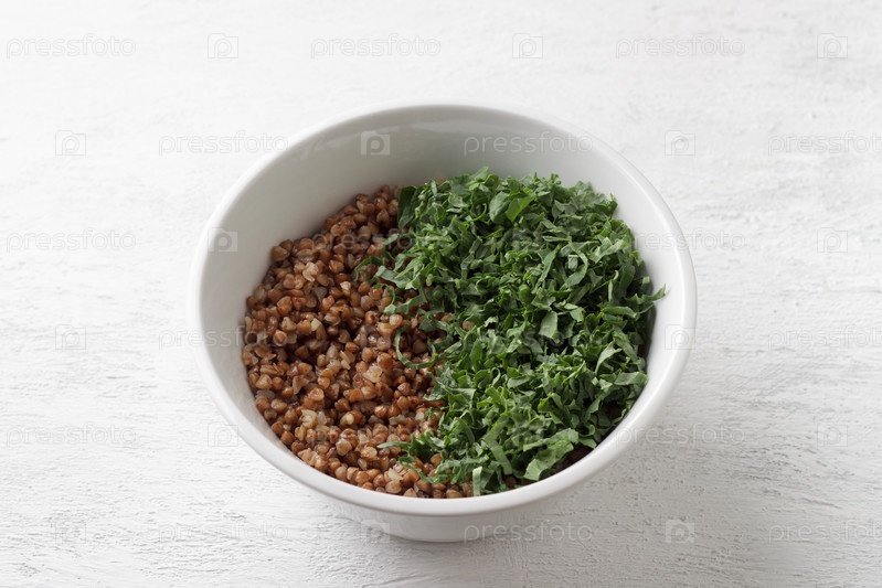 Белая миска с вареной гречкой и капустой на сером фоне, вид сверху. Здоровая домашняя веганская еда