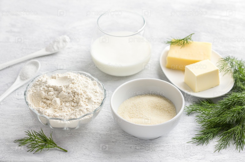 Вегетарианские ингредиенты для выпечки: мука, манная крупа, сыр, масло, йогурт, укроп, соль и разрыхлитель на светло-сером фоне. Готовим вкусную домашнюю еду