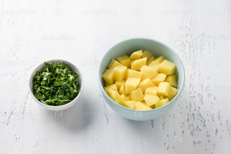Две миски с нарезанным картофелем и петрушкой на светло-голубом фоне, вид сверху. Готовим домашнюю веганскую еду