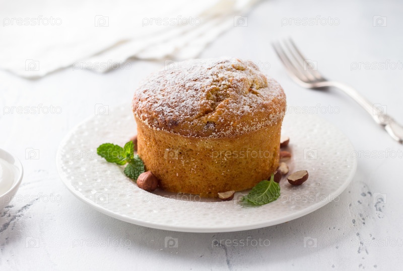 Свежеиспеченный сладкий домашний морковно-манный пирог или манник с орехами, посыпанный сахарной пудрой на светло-голубом фоне