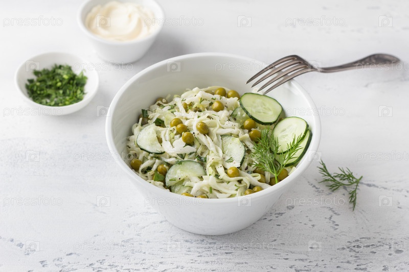 Салат с белокочанной капустой, зеленым горошком, огурцом, зеленью и майонезным соусом на светло-голубом фоне