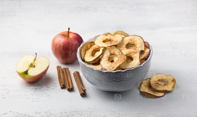 Домашние сушеные яблоки с корицей, яблочные чипсы в миске с палочками корицы на светло-сером фоне. Вкусная здоровая закуска