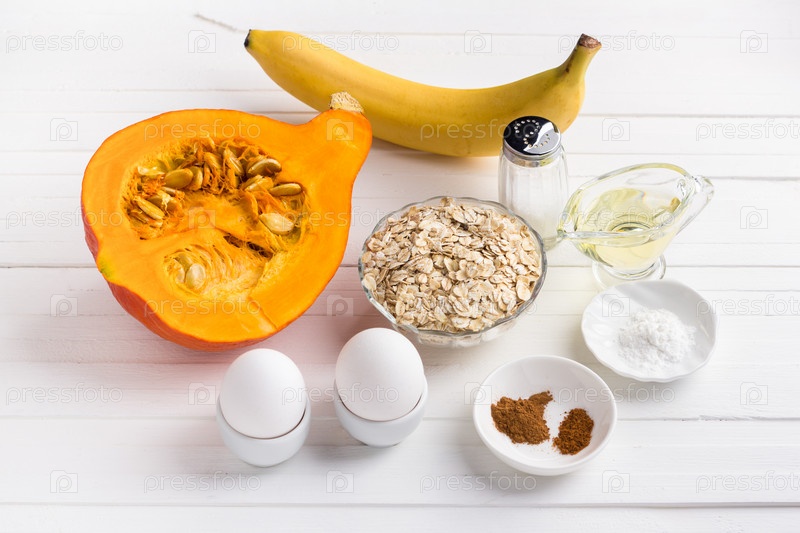 Ингредиенты для тыквенных блинов с овсянкой и бананом: тыква, банан, овсянка, яйца, растительное масло, специи, соль, разрыхлитель на белом фоне. Готовим вкусную вегетарианскую еду
