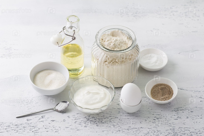 Ингредиенты для домашней выпечки: яйцо, сметана или йогурт, сахар, ванильный сахар, мука, растительное масло, разрыхлитель, соль на светло-голубом фоне