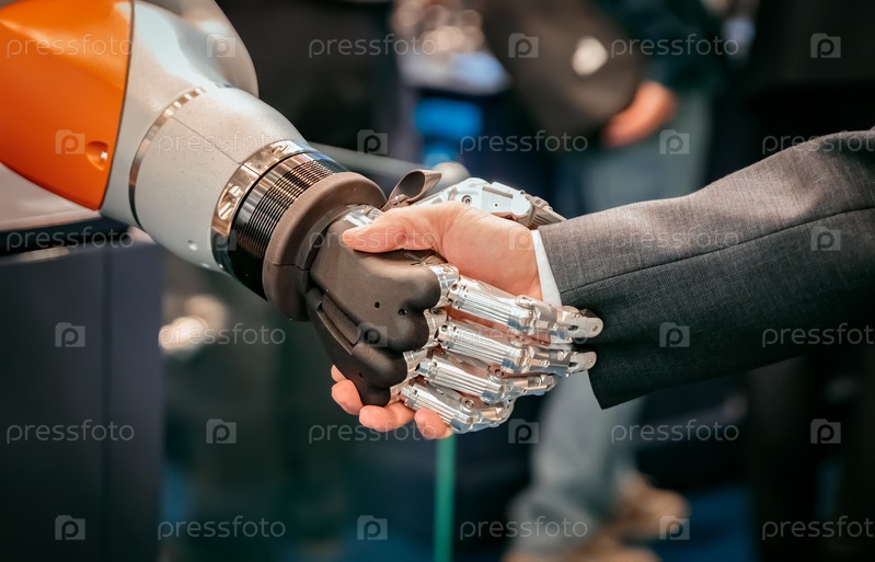 Рука бизнесмена пожимает руку роботу-андроиду