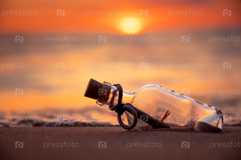 Послание в бутылке на фоне заката Солнца