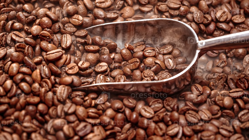 Крупный план семян кофе. Ароматные кофейные зерна обжариваются, дым исходит от кофейных зерен