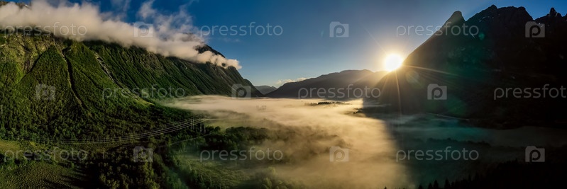 Утренний туман над долиной среди гор в солнечном свете