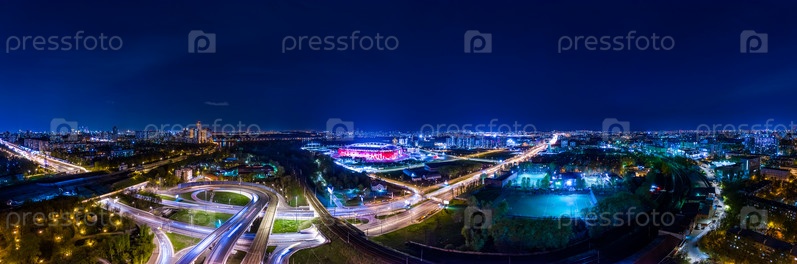 Ночная панорама вида с воздуха на перекресток автомагистралей с дорожными полосами в ночной Москве