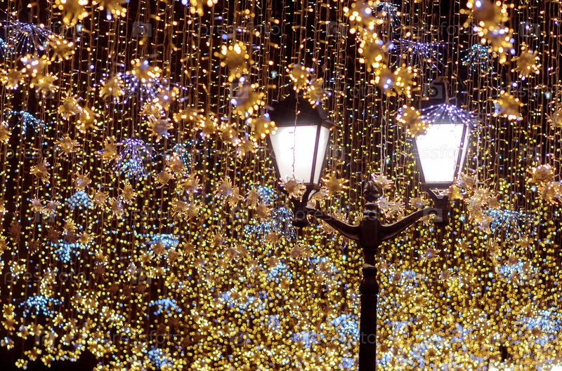 Уличный фонарь с декоративными рождественскими гирляндами. Празднование Нового года и Рождества