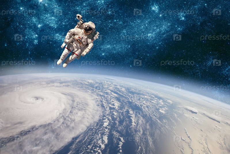 Астронавт в открытом космосе на фоне планеты Земля. Тайфун над планетой Земля