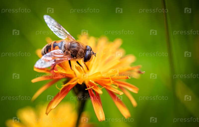 Пчеловодка или пчёлёнок собирает нектар из цветка crepis alpina