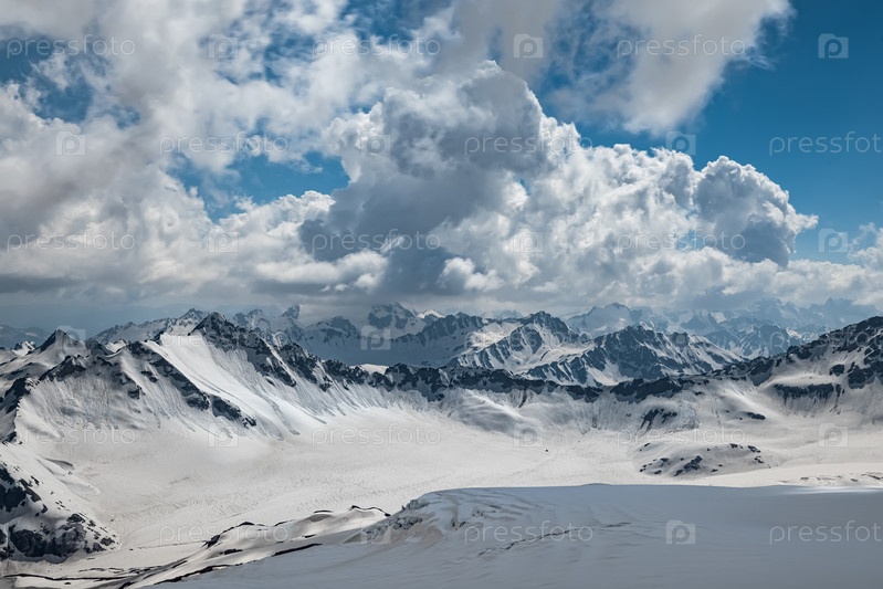 Горные облака над красивыми заснеженными вершинами гор и ледников. Вид на заснеженные горы
