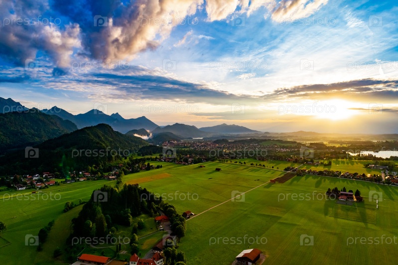 Панорама с воздуха заката Форгензее и Швангау, Германия, Бавария