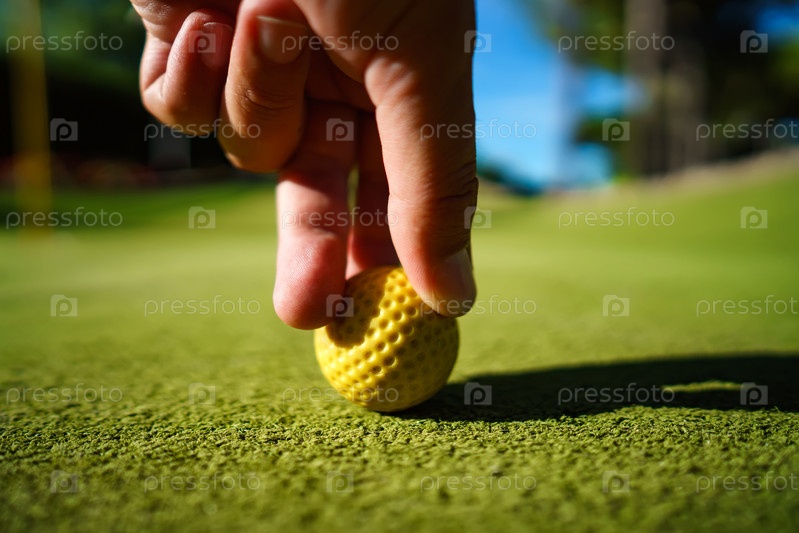 Желтый мяч для мини-гольфа на зеленой траве на закате