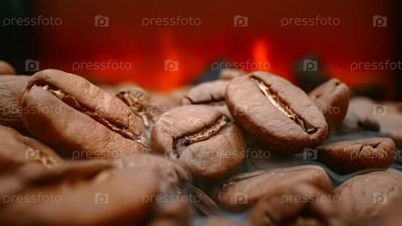 Крупный план семян кофе. Ароматные кофейные зерна обжариваются, дым исходит от кофейных зерен