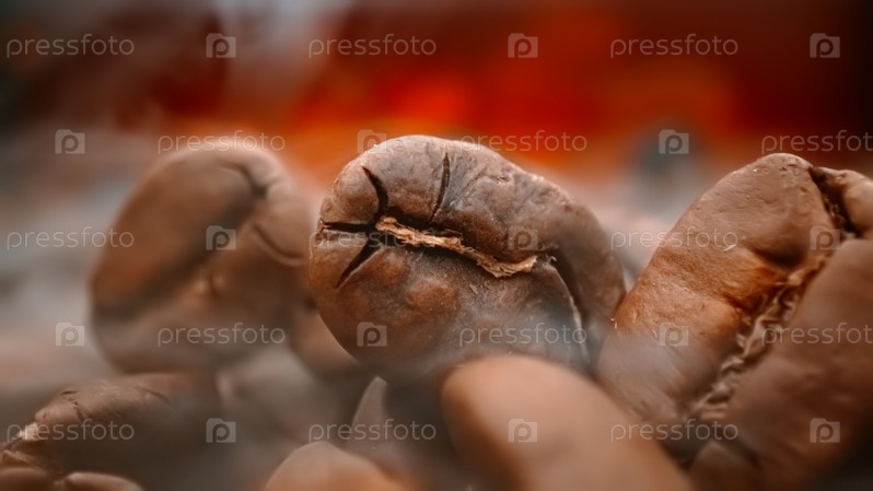 Крупный план семян кофе. Ароматные кофейные зерна обжариваются, дым исходит от кофейных зерен