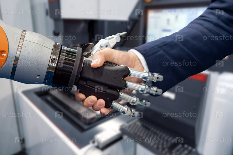 Рука бизнесмена пожимает руку роботу-андроиду