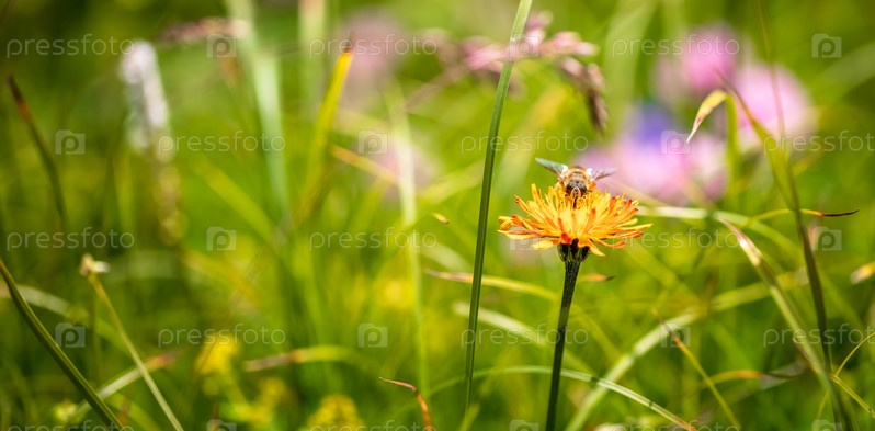 Пчела собирает нектар из цветка crepis alpina