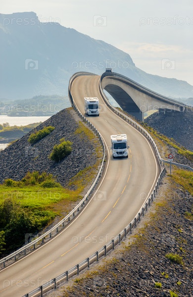 Грузовик движется по трассе Atlantic Ocean Road в Норвегии