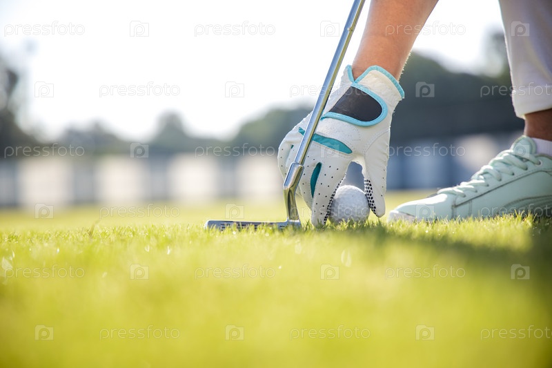 Рука в перчатке кладет мяч для гольфа на ти