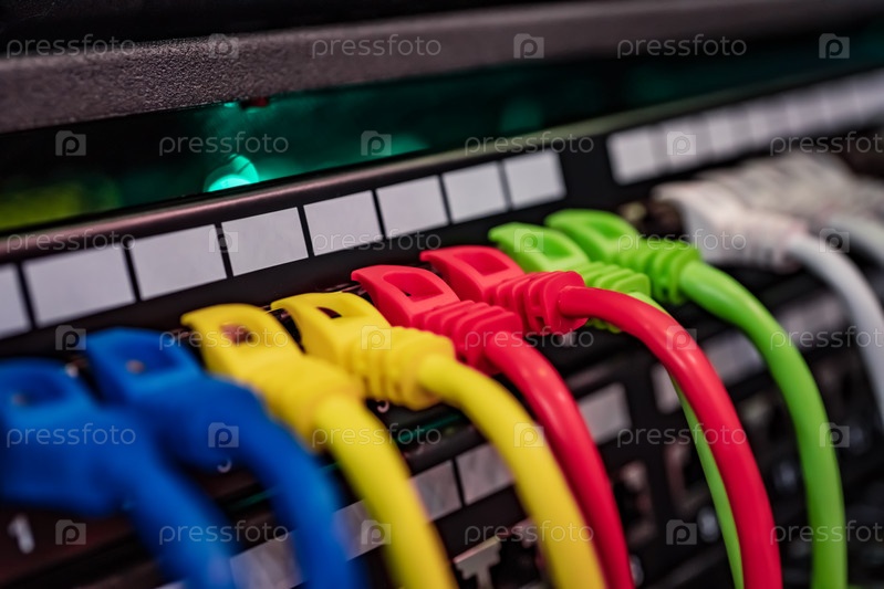 Цветовые телекоммуникационные кабели Ethernet, подключенные к коммутатору в центре обработки данных Интернета