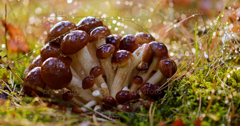 Грибы опенки В солнечном лесу под дождем