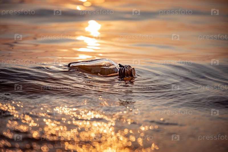 Послание в бутылке на фоне заката Солнца
