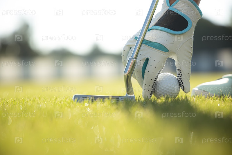 Рука в перчатке кладет мяч для гольфа на ти