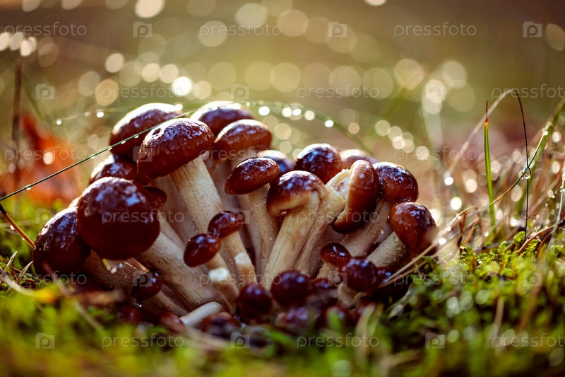 Грибы опенки В солнечном лесу