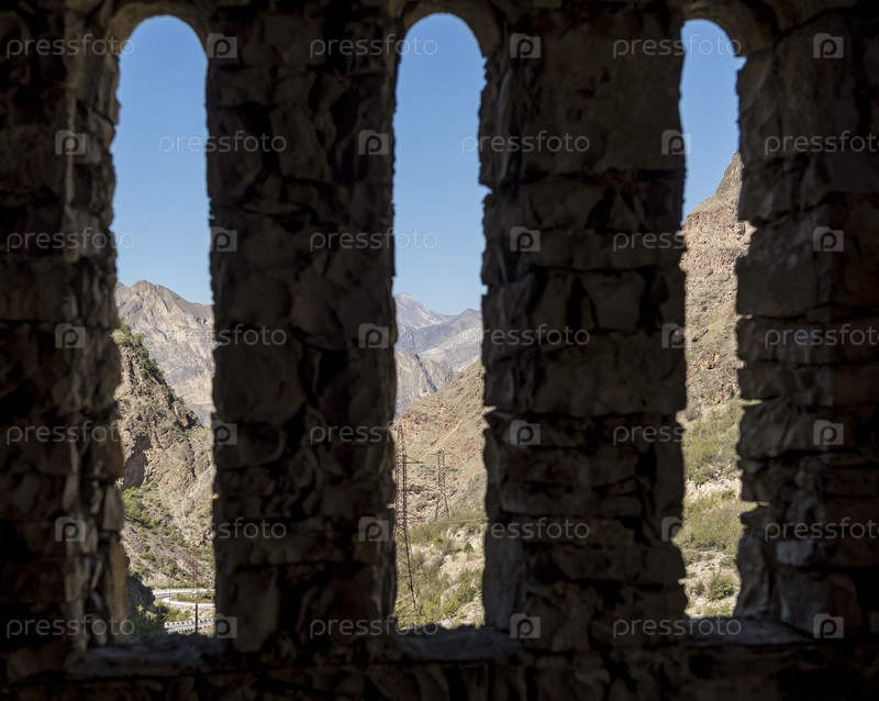 Кавказские горы. Дагестан. Вид скозь бойницы из башни вблизи селения Гимры