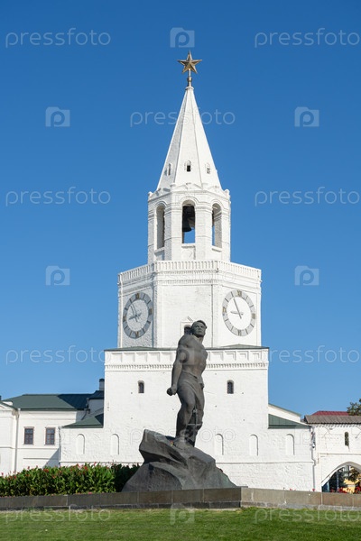 Памятник Мусе Джалилю на фоне Спасской башни Казанского Кремля
